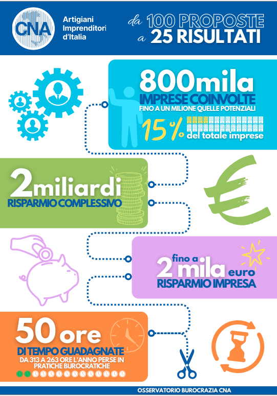 Un risultato di grande rilevanza per il sistema delle piccole imprese. Il pacchetto di misure consentirà di ridurre il costo della burocrazia di circa 2 miliardi di euro l’anno, con un risparmio stimato tra i 1.500 e i 2.000 euro per ciascuna impresa. Il monte ore dedicato alle pratiche burocratiche scenderà da 313 a 263 ore annue, con una riduzione compresa tra le 30 e le 50 ore all’anno.