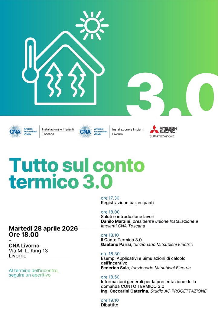 Martedì 28 aprile 2026 alle ore 18.00, presso CNA Livorno (Via M. L. King 13), si terrà un incontro dedicato al tema del Conto Termico 3.0, organizzato in collaborazione con Mitsubishi Electric e CNA Toscana.