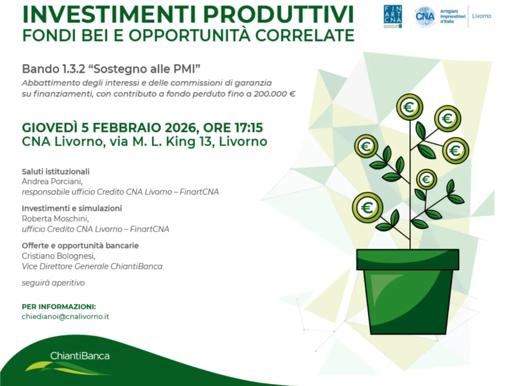 L’evento, in programma giovedì 5 Febbraio 2026 alle ore 17.15, presso la sede di CNA Livorno, mira ad illustrare le opportunità legate alla misura della Regione Toscana in sostegno alle piccole e medie imprese, in particolare l’abbattimento degli interessi e delle commissioni di garanzia su finanziamenti, con contributo a fondo perduto fino a 200.000 €.